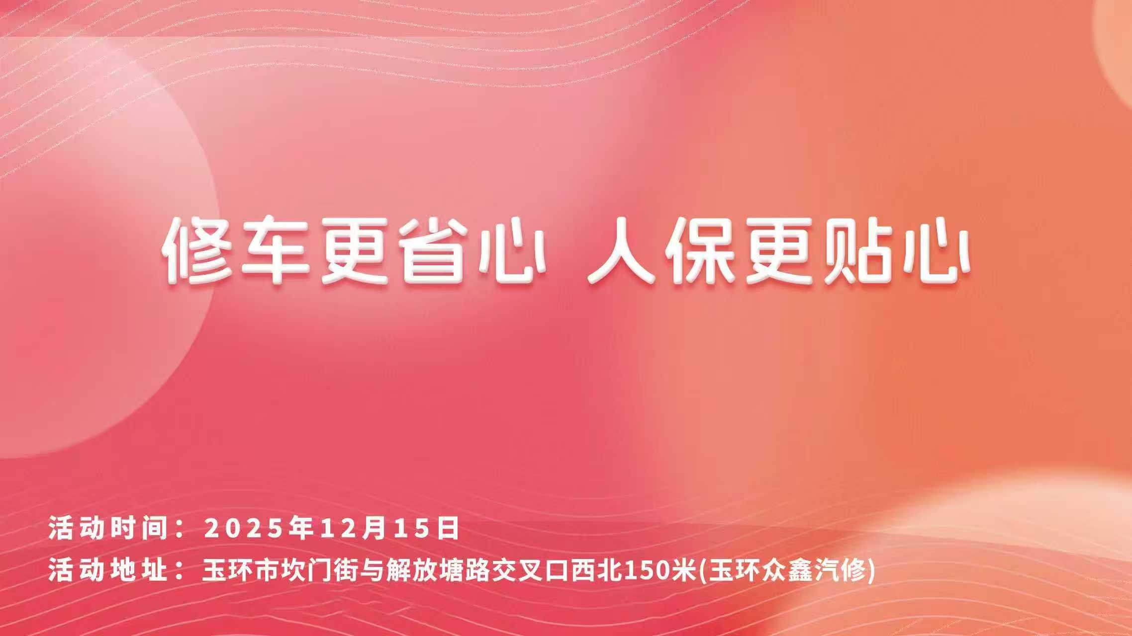 2025年12月15日,中国人民财产保险股份有限公司玉环支公司将走进玉环众鑫汽修,开展“修车更省心,人保更贴心”专项活动。活动现场,专业保险顾问将提供一对一免费咨询,详细解读车险条款、测算续保费用、分析保障缺口,针对新车车主、老司机、新能源车主等不同群体定制专属保障计划,让您投保更划算、用车更舒心。